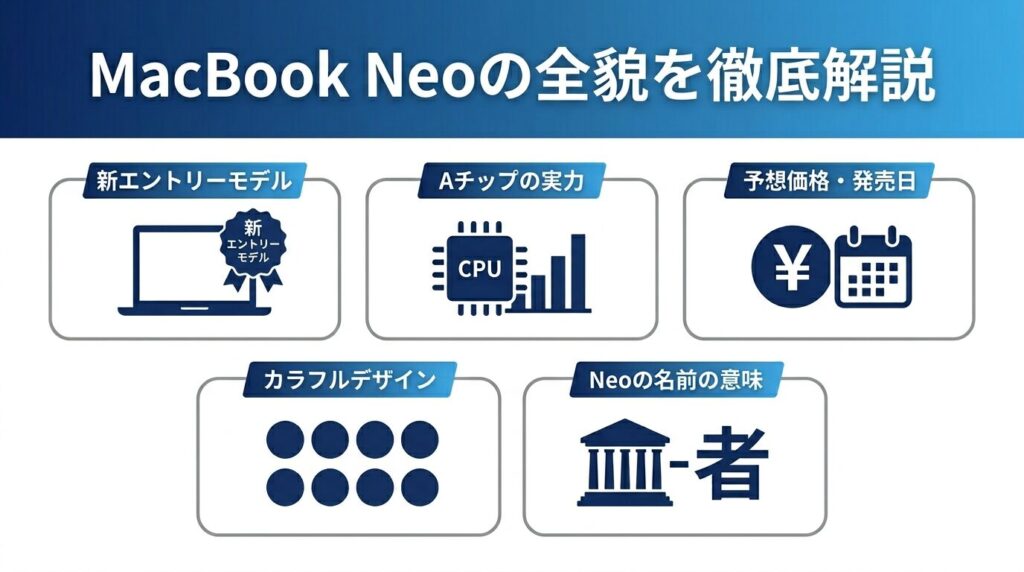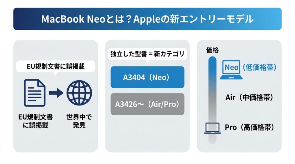 MacBook Neoとは、Appleが2026年に発表するiPhoneチップ(A18 Pro相当)搭載の低価格MacBookで、モデル番号はA3404、Macシリーズ初のエントリーグレードモデルです。