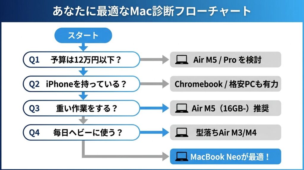 ここまで読んで「結局、自分にはどのMacが合っているの?」と迷っている方も多いかと思います。そこで、4つの質問に答えるだけで最適なモデルがわかる診断フローチャートを作りました。