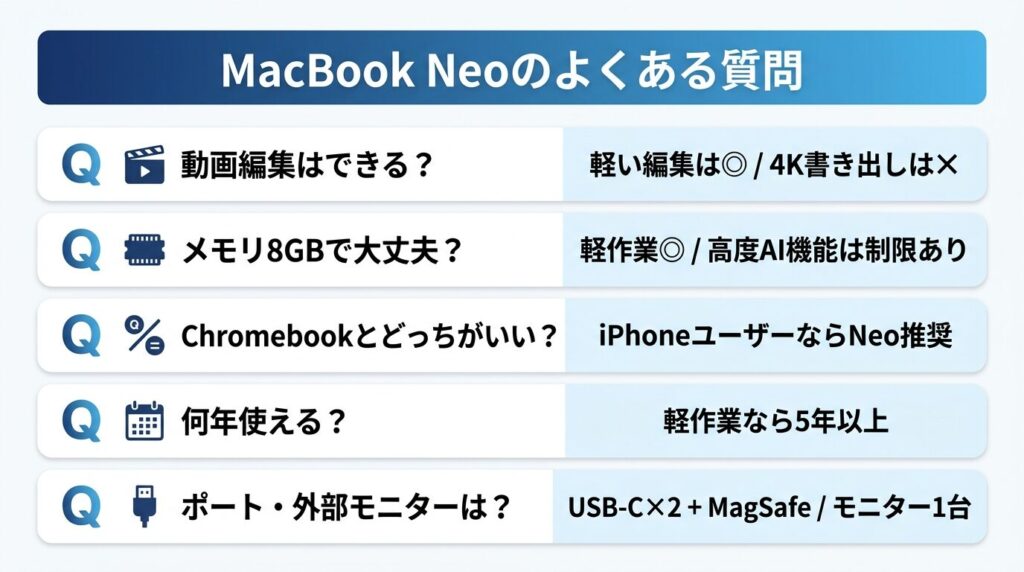 Redditの購入相談スレでは「医学部生で、Ankiメインの使用」「ストリーミングとブラウジングだけ」といった質問が典型的ですが、こうした用途にはMacBook Neoがぴったりです。一方、「映像・音楽・メディア系の学生にはNeoでは物足りない。Air M5以上を推奨する」という回答も多く見られますので、用途に正直に向き合うことが大切ですね。