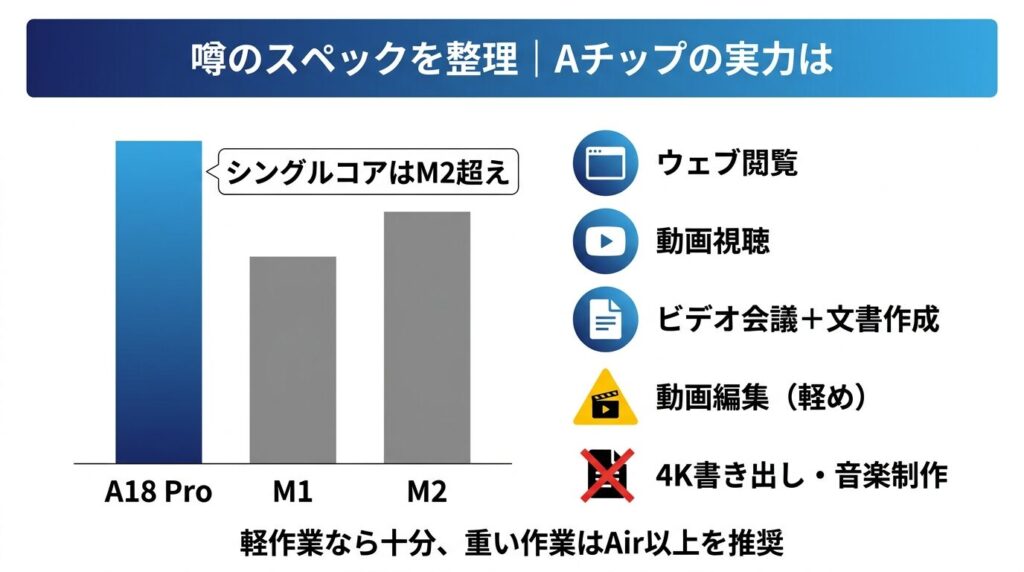 実はこのシングルコアスコア、2年前のM2 MacBook Airを大きく上回る数値なんです。マルチコアではM1とほぼ互角、M2にはやや及ばないという位置づけですね。「格安モデル」と聞くと性能が不安になりますが、日常的な使い方であれば前世代のMacBook Airと互角以上のパフォーマンスが期待できるということです。MacRumorsのまとめ記事でも「A18 ProはM1を上回り、日常用途のMacBookとして十分なパフォーマンスを持つ」と分析されています。