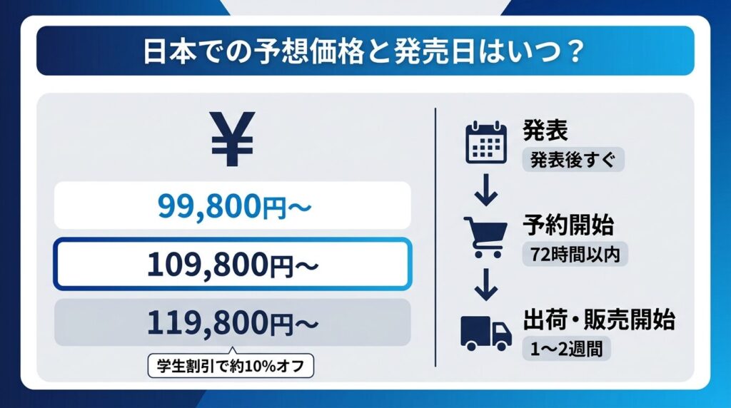 | $599 | ¥89,850 | 約¥98,800〜99,800 | 10万円を切る戦略的価格の可能性 |