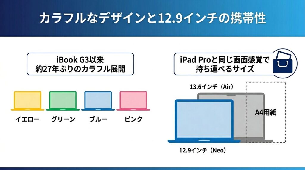 - MacBook NeoはA18 Proを搭載した初のiPhoneチップMacで、12.9インチのカラフルなエントリーモデル。