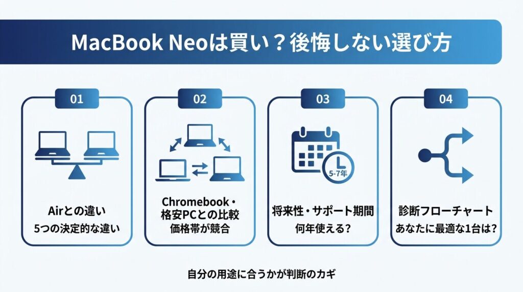 ここからは、「結局、MacBook Neoは自分にとって買いなのか?」という最も重要な問いに答えていきます。数万円〜十数万円の買い物で後悔したくない気持ちはよくわかります。MacBook Airとの違い、Chromebookや格安PCとの比較、そして将来性まで、判断材料をすべてそろえた上で、あなたにぴったりの一台を見つけるお手伝いをしますね。