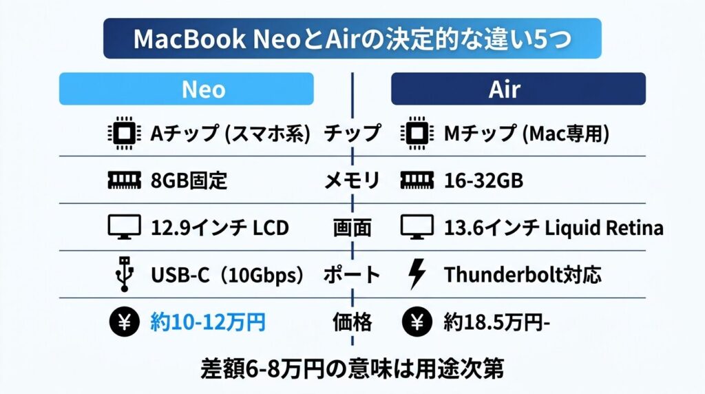 MacBook Neoを検討する際に、真っ先に比較対象になるのがMacBook Airですよね。「4〜7万円安いNeoで十分なのか、それとも奮発してAirにすべきか」——この悩み、とてもよくわかります。ここでは決定的な違いを5つの軸で整理します。