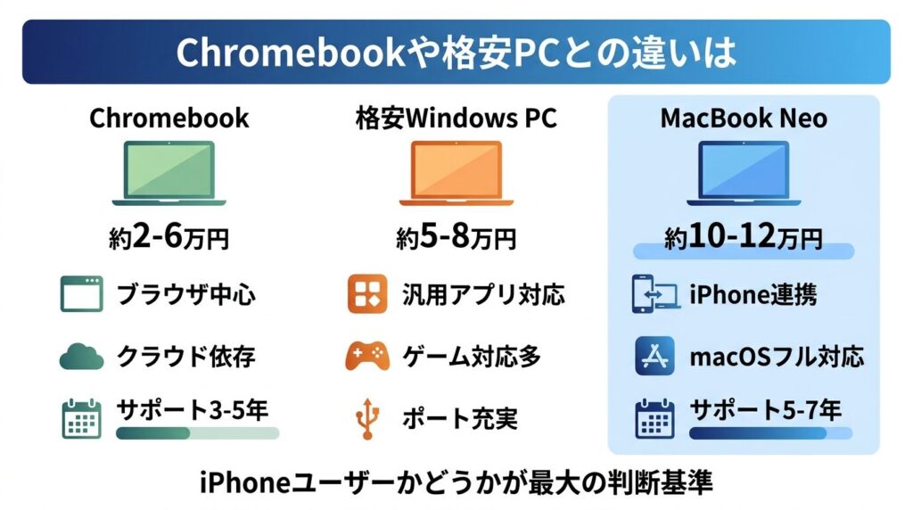 MacBook Neoの話題で意外と見落とされがちなのが、「そもそもChromebookや格安Windows PCと比べてどうなの?」という視点です。$599〜$799という価格帯は、まさにChromebookの上位モデルや格安Windows PCとガチンコで競合するゾーンなんですよね。