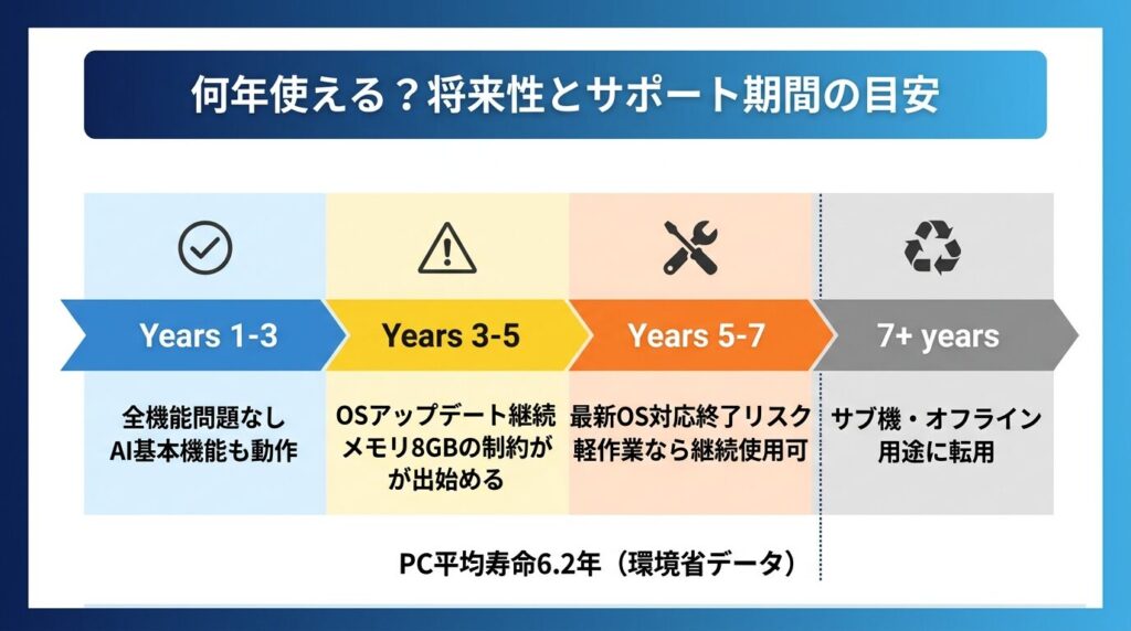 3つ目は、Appleのサポート実績と環境省のデータ(ノートPC平均寿命6.2年)から推定して5〜7年の使用が見込めるものの、メモリ8GBが将来のAI機能展開において制約になる可能性があるということ。3年は安心、5年目以降は用途次第というのが現実的な見通しです。
